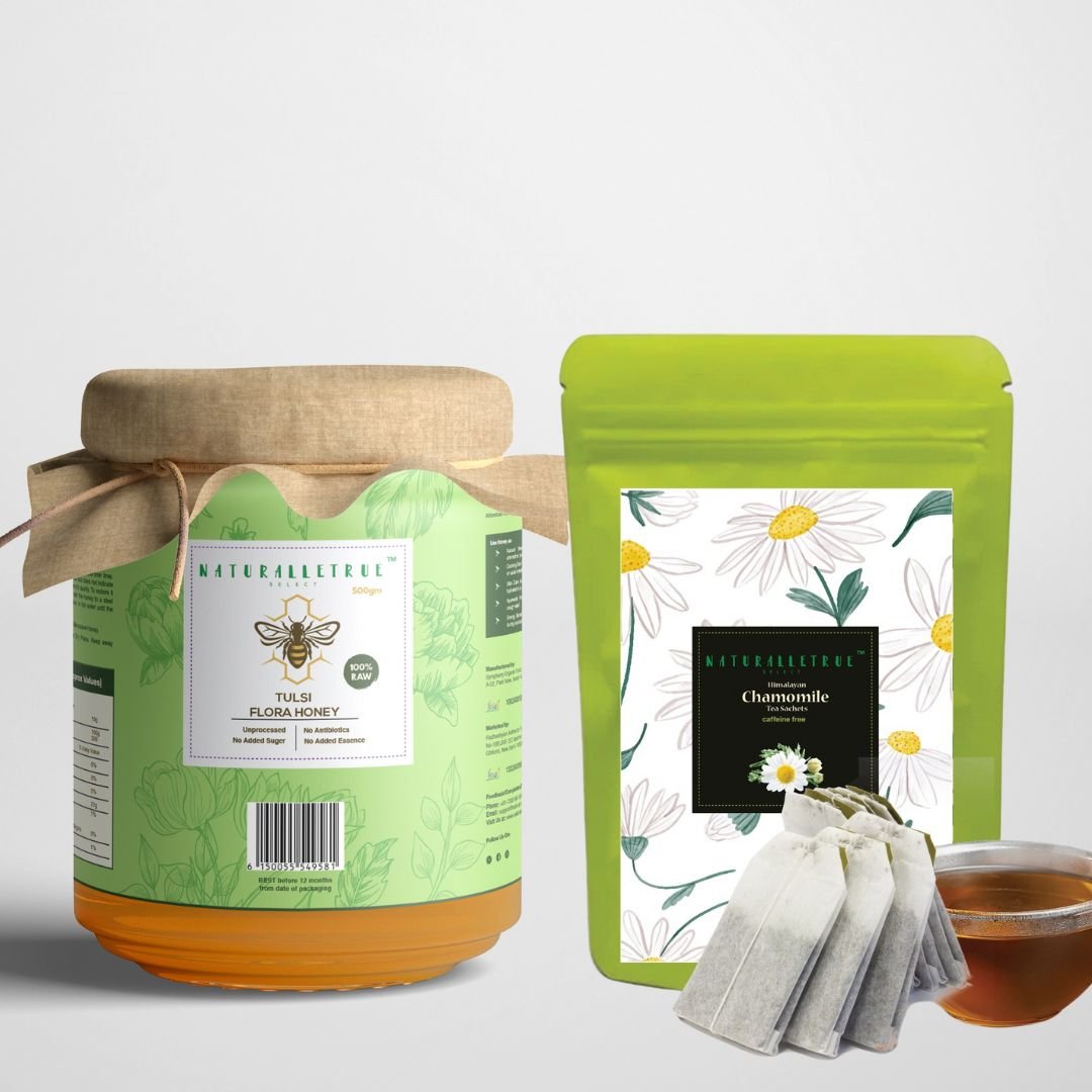 Experience the perfect harmony of NaturalleTrue Chamomile Tea & Tulsi Honey, a wellness duo crafted for relaxation, immunity, and overall health. Our premium chamomile tea sachets provide a soothing and refreshing tea experience, while our 100% pure tulsi honey, sourced from tulsi-rich floral regions, offers natural sweetness with added health benefits. This powerful combination helps reduce stress, supports digestion, and boosts immunity, making it an ideal choice for daily wellness. Elevate your tea time with the pure goodness of chamomile and tulsi honey!